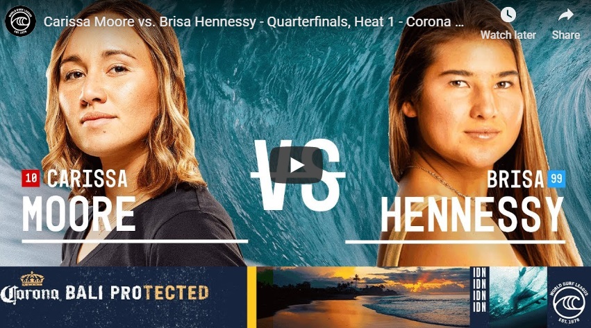 Surf By Girlifornia, 28 December, 2019 Video Url Carissa Moore takes on Brisa Hennessy in Heat 1 of the Quarterfinals at the 2019 Corona Bali Protected W