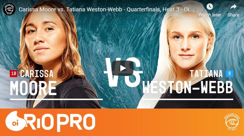 Surf By Girlifornia, 29 December, 2019 Video Url Carissa Moore takes on Tatiana Weston-Webb in Heat 3 of the Quarterfinals at the 2019 Oi Rio Pro