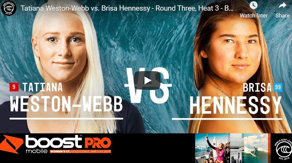 Surf By Girlifornia, 25 December, 2019 Video Url Tatiana Weston-Webb battles Brisa Hennessy in Round Three, Heat 3 at the 2019 Boost Mobile Pro Gold Coast Australia.