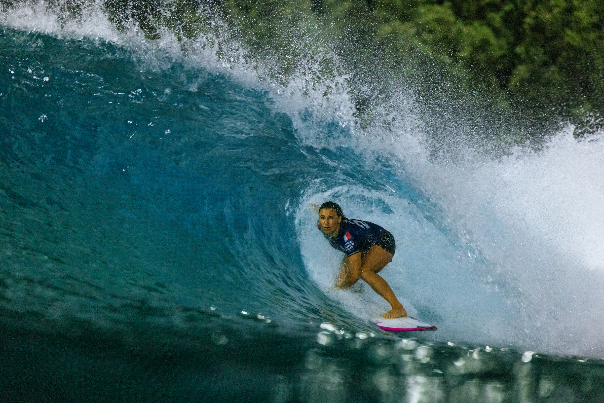 “I feel really grateful that I have a great team,” said Moore. “My coach and my husband are here, and some of my really close friends and family are here to support so that love really helps. I think the hardest part about the pool, like Kelly (Slater) said earlier, is just being present and at peace. It’s finding that happy place when you know that train starts coming at you.”